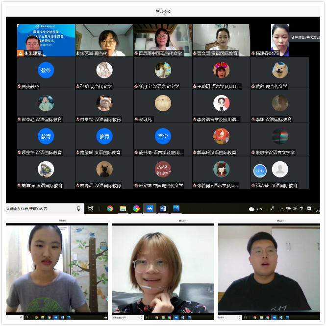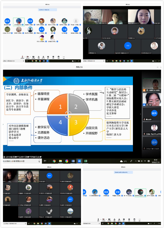 开营仪式结束后,国交学院陈慧忠、唐依力、吴春相、邵洪亮四位老师结合自己的学术研究领域和学院专业特点,分别从文化自信与自省、认知构建与语言理解、汉语语言研究、汉语中的羡余现象等方面,给营员们带来了精彩的学术讲座。7月18日,涂昕、缪俊、鹿钦佞三位老师先后进入云端会议室,分别给营员们带来了以“我为什么选择了中国现当代文学”“语言运用中的偏离与偏误”“国际汉语教师应当具备的素质”为题的讲座。七场讲座从宏观到微观,从文学到语言,从理论到应用,全方位、多角度地为营员介绍了各学科的发展前沿、研究生学习与科研应具备的基本素养等内容,展示了国交学院严谨治学、兼容并包的学术氛围和中外交融的文化魅力,对营员拓宽学习和科研视野、增进对上外和国交学院的了解具有积极意义。讲座也引导营员对专业学习和未来生活进行深入思考,在各场讲座结束以后,营员们踊跃提问,与老师们作了进一步的交流与探讨。
