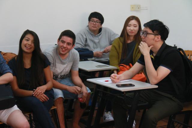本次活动分成七个小组展开,每个小组不同主题,吸引了许多的留学生同学驻足参与。有的小组带着工具教留学生剪纸,体验中国艺术;有的小组与留学生玩起了各式各样的游戏,比如“谁是卧底”、“杀人游戏”、“击鼓传花”等等,在游戏中练习汉语;有的小组教留学生写毛笔字,欣赏书法艺术……汉国教的研究生们发挥自身的特长,组织了各式各样的文化体验及互动活动。在“汉语角”期间,教室内外都充满了欢声笑语,留学生们不仅在快乐中提高了汉语水平,也借此机会收获了新的友谊。