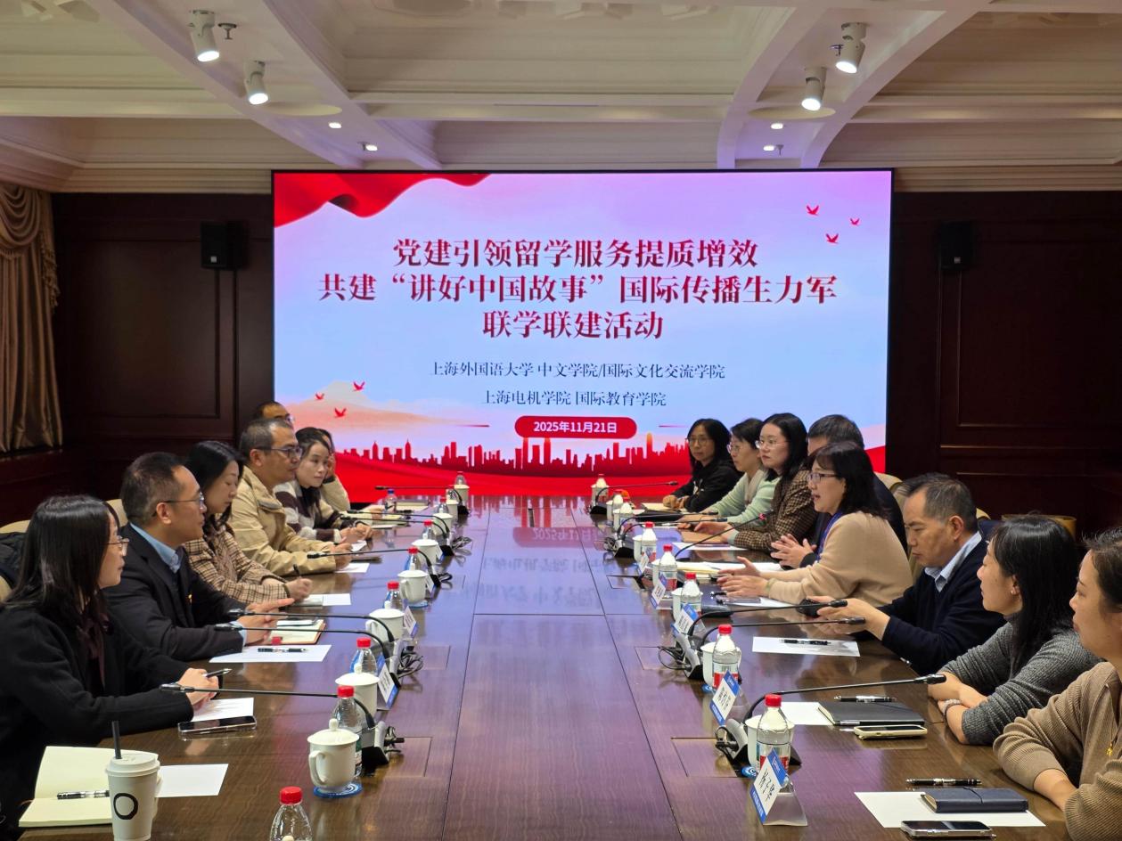 20251121日,上海外国语大学中文学院/国际文化交流学院教工第二党支部与上海电机学院国际教育学院党支部共同举办校际党建联学主题党日活动。本次活动以“党建引领留学服务提质增效,共建‘讲好中国故事’国际传播生力军”为主题,聚焦国际化人才培养与留学服务升级等核心议题开展研讨。上海外国语大学中文学院/国际文化交流学院党委书记张艳莉、院长陈昌来,上海电机学院国际教育学院党总支书记何宁、院长鹿钦佞及双方教师代表参会,共绘校际协同发展新蓝图。