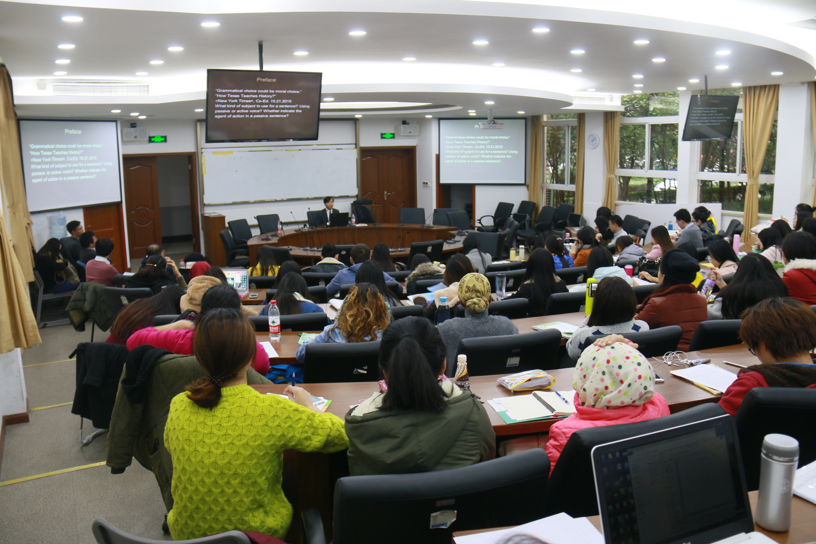 在两个多小时的讲座中,刘教授对于治学和教学的诚挚而认真的态度给大家留下了深刻的印象。他在理论语法和教学语法等诸理论中游刃有余,如鱼得水,成功地烹制了一次美妙绝伦的精神盛宴,让人意犹未尽,受益匪浅,赢得了在座师生热烈的掌声。