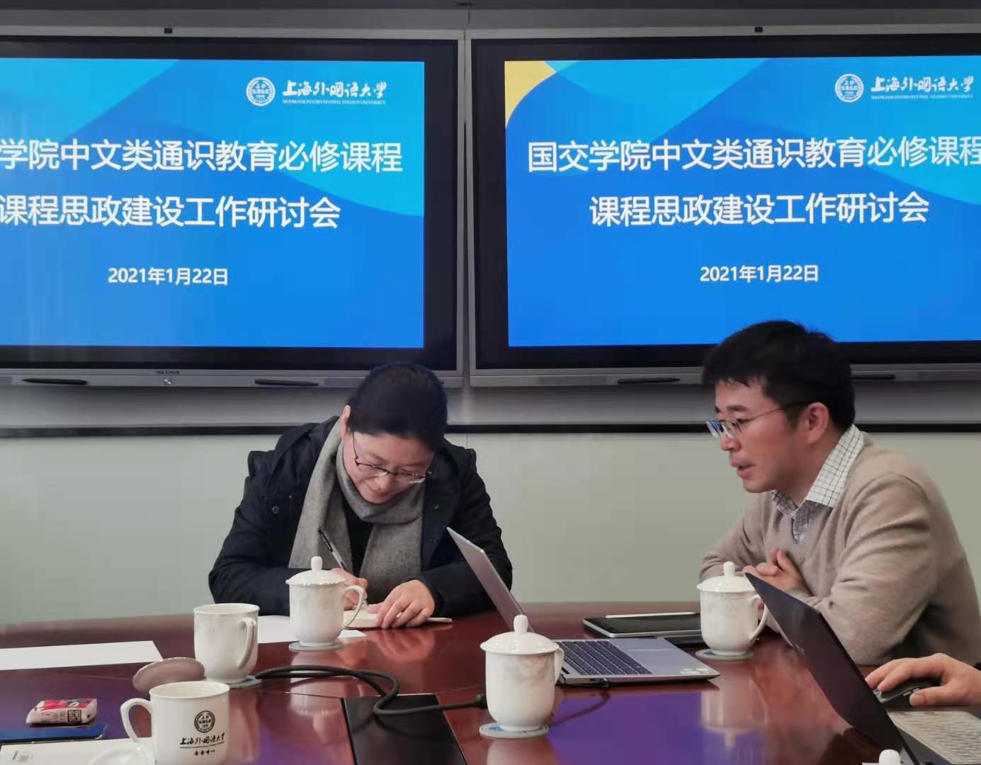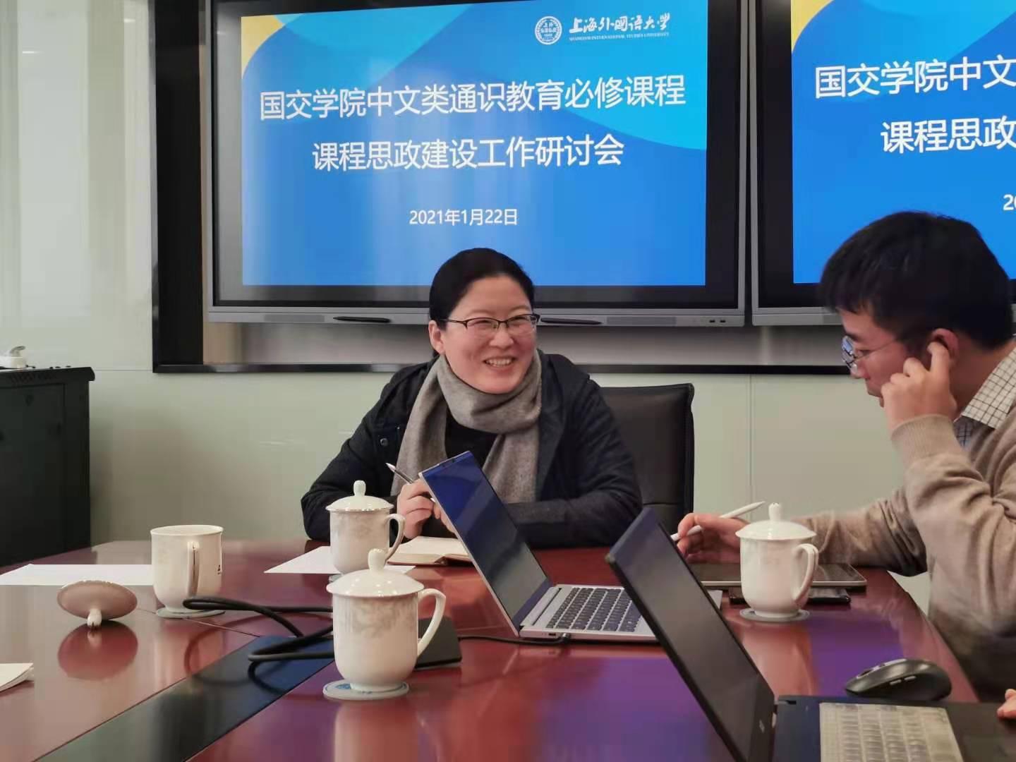 2021年1月22日下午,上海外国语大学国际文化交流学院中文类通识教育必修课思政建设工作研讨会于虹口校区一号楼1010室举行。教务处副处长王会花、国交学院党委书记陈全生、副院长朱建军、中国语言文化教研部主任唐依力和中文类通识教育必修课程任课老师出席了此次会议。与会老师再次学习了教育部《高等学校课程思政建设指导纲要》的指导意见,围绕中文类通识教育必修课“课程思政”建设的现状和方向展开了积极的讨论,不同课程之间也进行了深入的交流。