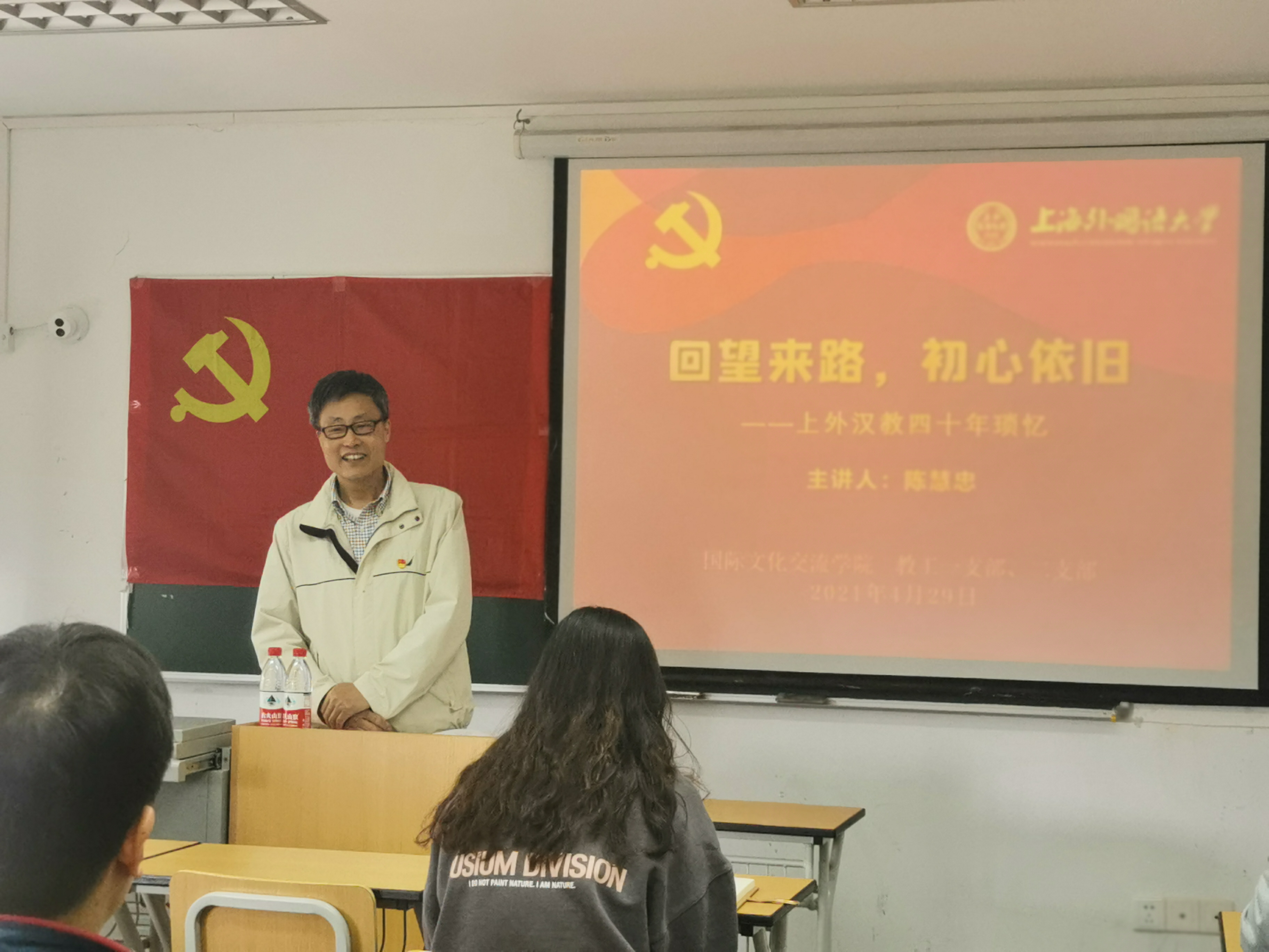 在这堂题为《回望来路,初心依旧》的党课上,陈慧忠教授以丰富翔实的资料展示了近40年来,前辈们是如何呕心沥血开辟上外汉教事业的,一代又一代的国交人是如何前赴后继投身学院各条线工作的。从黑白照片到彩色影像,陈慧忠教授以亲身经历寄语新一代国交人:把个人成长与国家发展紧密联系起来,不忘初心,勇敢担当,齐心协力开创学院发展和汉教事业的新篇章!
