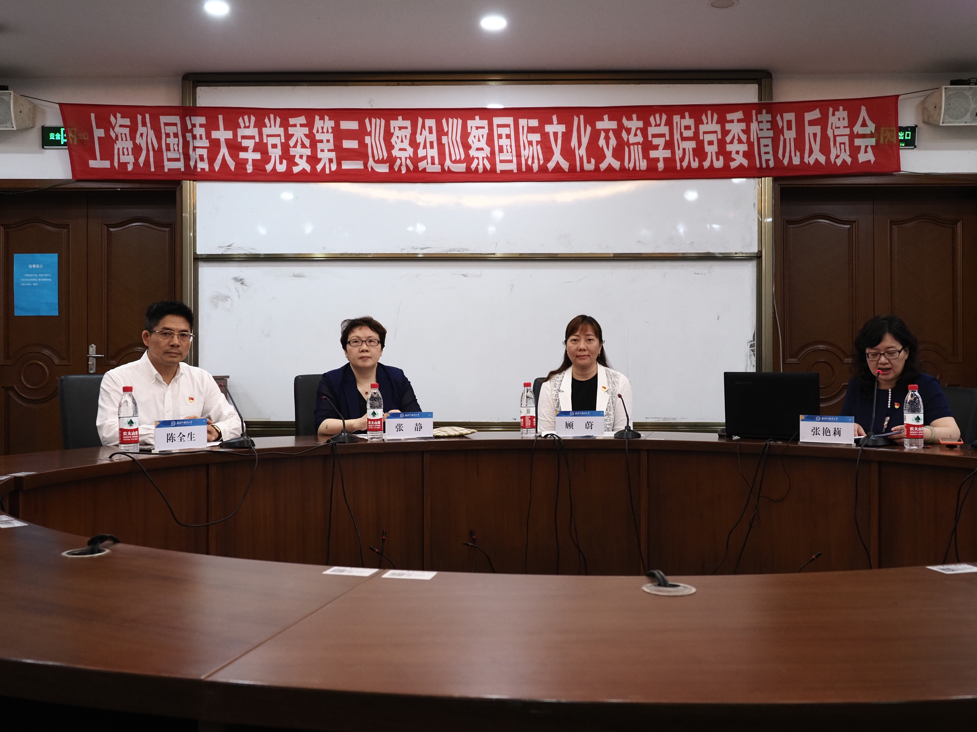 根据校党委统一部署,近日,上海外国语大学党委第三巡察组向国际文化交流学院党委反馈巡察情况。2021年6月8日,上海外国语大学党委第三巡察组组长顾蔚向党委书记陈全生、院长张艳莉进行个别反馈,会上校党委副书记、纪委书记、巡察工作领导小组副组长钱玲传达校党委指示精神并开展全面从严治党工作谈话。2021年6月11日,顾蔚代表上海外国语大学党委第三巡察组进行大会反馈。联系校领导张静传达校党委指示精神并对巡察整改工作提出要求。陈全生作表态发言。张艳莉主持会议。