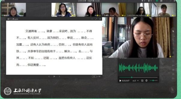 我三十多岁了,是个全职太太,我年轻时忙着工作,最近几年忙着照顾家庭,现在终于有时间能空下来好好学习。我不想浪费每一分每一秒,我非常享受学习的过程。有一次去医院做手术的期间,打着麻药的我也还在坚持上课。上海外国语大学还提供了各种各样的讲座,老师讲得非常清楚,都能听懂。