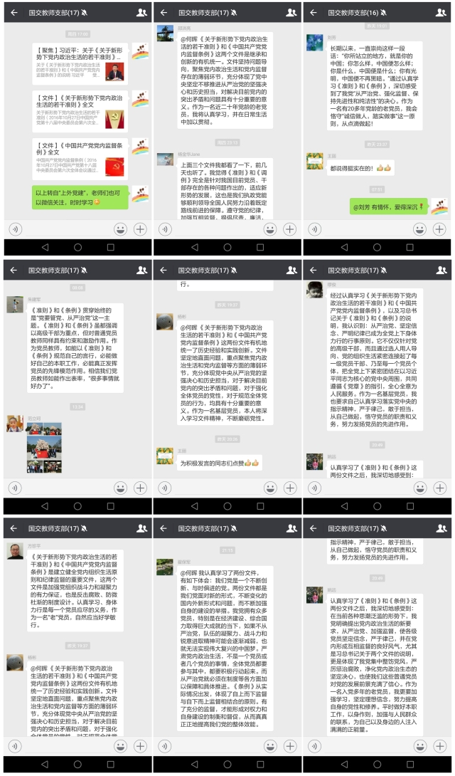 近日,国际文化交流学院教师党支部举行组织生活会,认真学习十八届六中全会精神。此次活动以支部微信群畅谈的新形式展开,教师党员们认真学习了《关于新形势下党内政治生活的若干准则》和《中国共产党党内监督条例》两份重要文件及相关解读文章,并在网络平台上热烈讨论、交流心得。