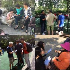 一进公园,一位抱着孩子的年轻妈妈就接受了印尼学生张翠慧和苏晶晶的采访,顺利的开始燃起了她们的兴致。不一会儿,她们又跟刚练完太极的两位阿姨攀谈了起来。