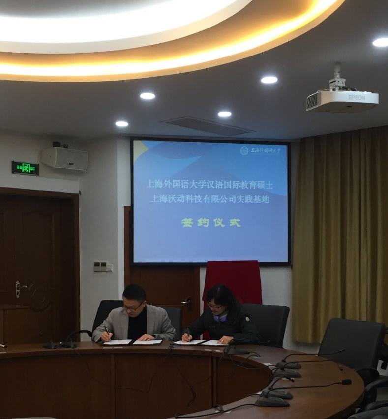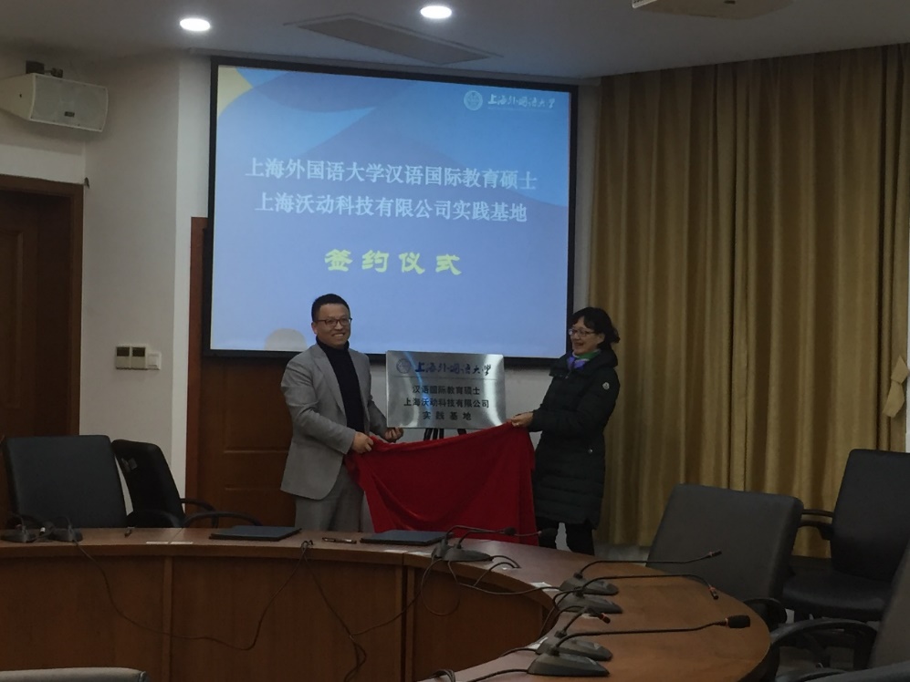 讲座结束后,国际文化交流学院院长张艳莉教授与邱利军先生共同签署了建立“上海外国语大学汉语国际教育硕士上海沃动科技有限公司实践基地”的协议并举行了揭牌仪式。
