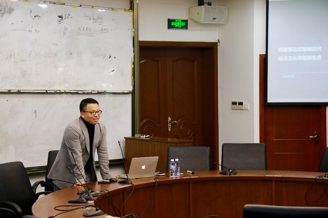 2017年12月8日下午,上海沃动科技有限公司创始人邱利军先生在国际文化交流学院做了一场题为《移动互联网时代如何实现语言文化交流新生态》的讲座,向国交学院师生展示了上海沃动科技有限公司研发的一款全球即时响应的语言服务APP——PopOn的设计理念和运行模式。