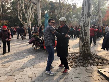 中午,学生们都陆续做完了采访问卷。气温升高了,公园里的人更多了,更热闹了:跳舞的,写毛笔字的,打太极拳的,打羽毛球的,弹琵琶的,抖空竹的……同学们这边走走,那边看看,着实感受了一番中国的公园文化。兴致来了,还和叔叔跳了一支舞呢。