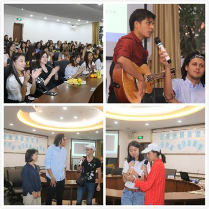 本次语伴见面会由留学生陈安忆和中国学生冯婉玉共同主持。在主持人的引领下,中外学生都寻找到了各自的语伴。大家相互交流,希望能够更多地了解对方,气氛顿时变得热烈了起来。紧接着本次见面会迎来了两个小高潮。一个是由中外学生共同带来的文艺表演。中国学生蒋秀娟为大家带来了越剧《我家有个小九妹》选段。留学生王凯和陈安忆演唱了原创吉他歌曲《卡萨孔子学院》,向大家娓娓道来浪漫的卡萨布兰卡开出汉语之花的故事,极富感染力的歌声引发了全场的合唱;另一首歌曲《兄弟》则记录了他们在上外的学习生活,歌唱了同学间互帮互助的真挚友谊。来自日本的Andy Mendez 吉他弹唱《一封家书》,道出了对父母的感谢与思念。作为回应,中国学生李佳龙、鲁荣军等倾情献唱综合了多国语言的《If You》。第二个小高潮是击鼓传花的小游戏。在吉他声中,中外同学快速传递道具,气氛欢快而热烈。“幸运儿”们毫不怯场,与大家分享自己的经历,展示自己的才艺。