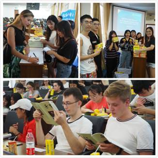 (左上:留学生签到;右上:汉语国际教育专业硕士学生担任活动志愿者;下:孔院生阅读留学生作文集《乐学》)