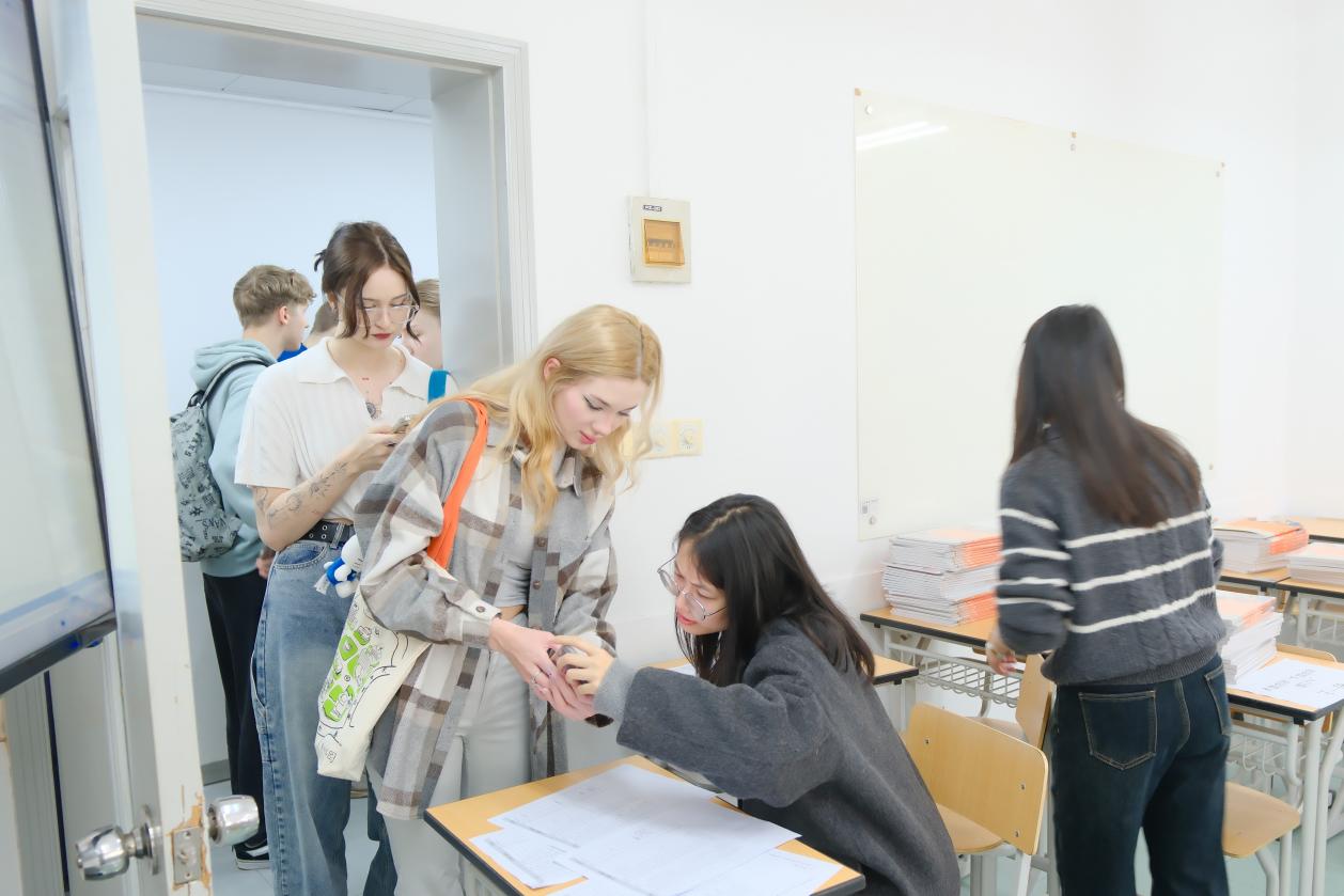 开学首周,松江校区中国本科生课堂氛围活跃,虹口校区留学生本科与中外研究生课程有序启动,留学生进修课程则于第二周起正式开课。学院统筹安排了线下教学与线上支持,确保教材发放、课程注册等环节高效运转。中外学生在专业课程、文化实践中深度互动,形成“语言共学、文化共融”的良好格局。