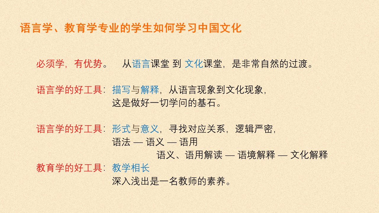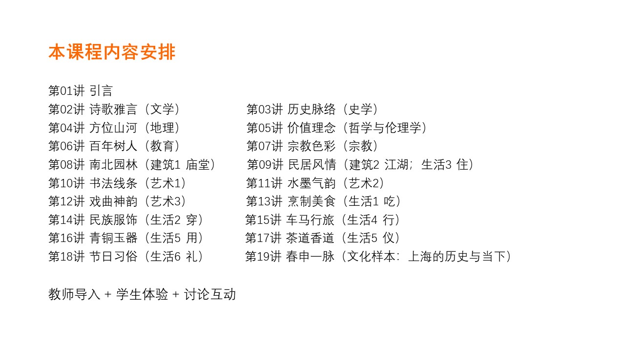 尽量从语言学的角度切入,彰显专业优势,在学科门类中找准专题定位,结合中国社会最新实践,既“顺流而下”梳理古今线索,又“溯源而上”寻根传统文化,通过有形实体与标识,理解中国人的精神价值、生活方式和集体人格,让学生豁然贯通。