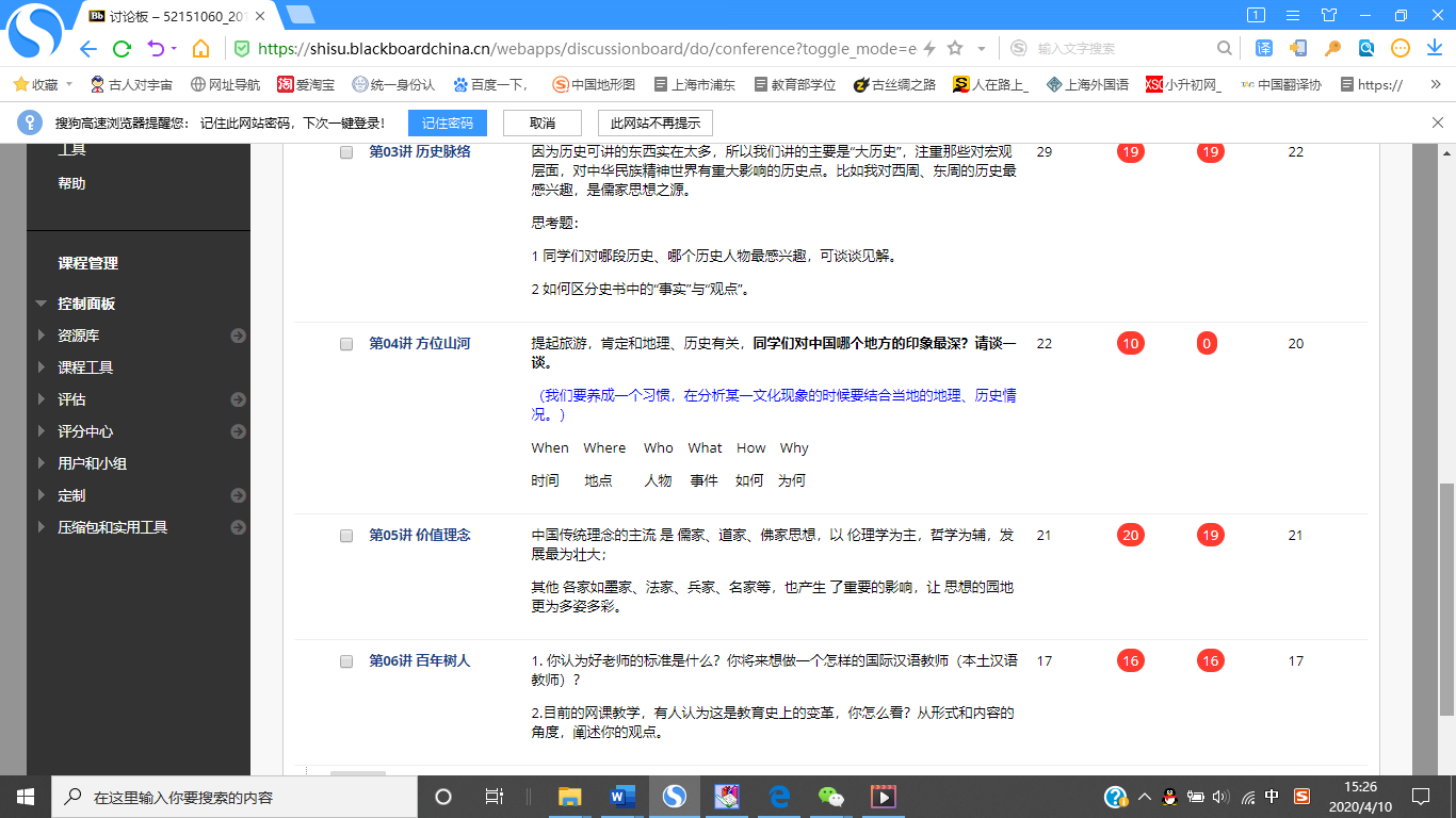 (3)学生的开口率、留言板互动率更高,这是“网络原住民”的优点。一次课下来,师生留言板互动的字数竟会破万字,虽书面互动很花时间,但考虑到将来汇编讲义,点滴积累,定功不唐捐。