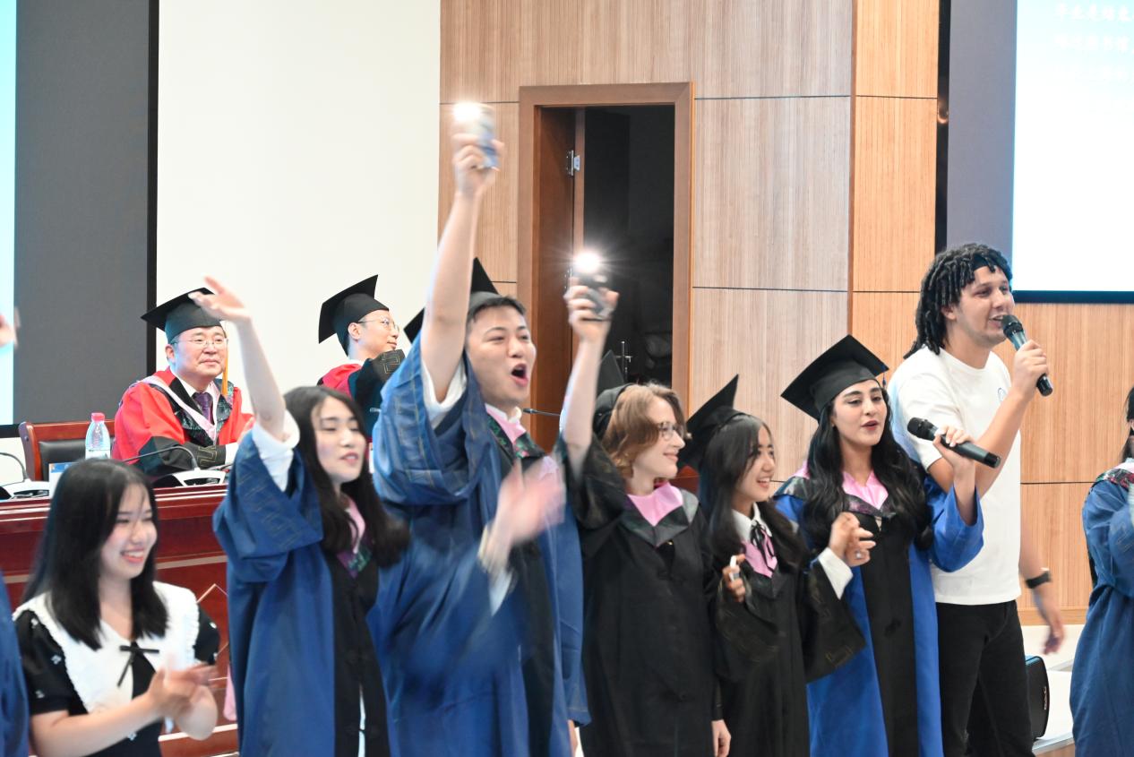 学位授予仪式结束后,由教师鹿钦佞、张昕雨、毕业生李璇、王陶然、王帅祺、CHANWIT SRISAKSOMBOON邓绍武(泰国)、ESRAA AYOUB ATA AYOUB甜心(埃及)及在校生高幸子、EL HOUCINE ZRAIDI陈安忆(摩洛哥)等师生9人,为毕业生们献上了毕业典礼的彩蛋——校园歌曲串烧。师生们通过音乐表达了对每一位毕业生的美好祝福,同学们也借着歌声表达了对母校和老师的感激之情。