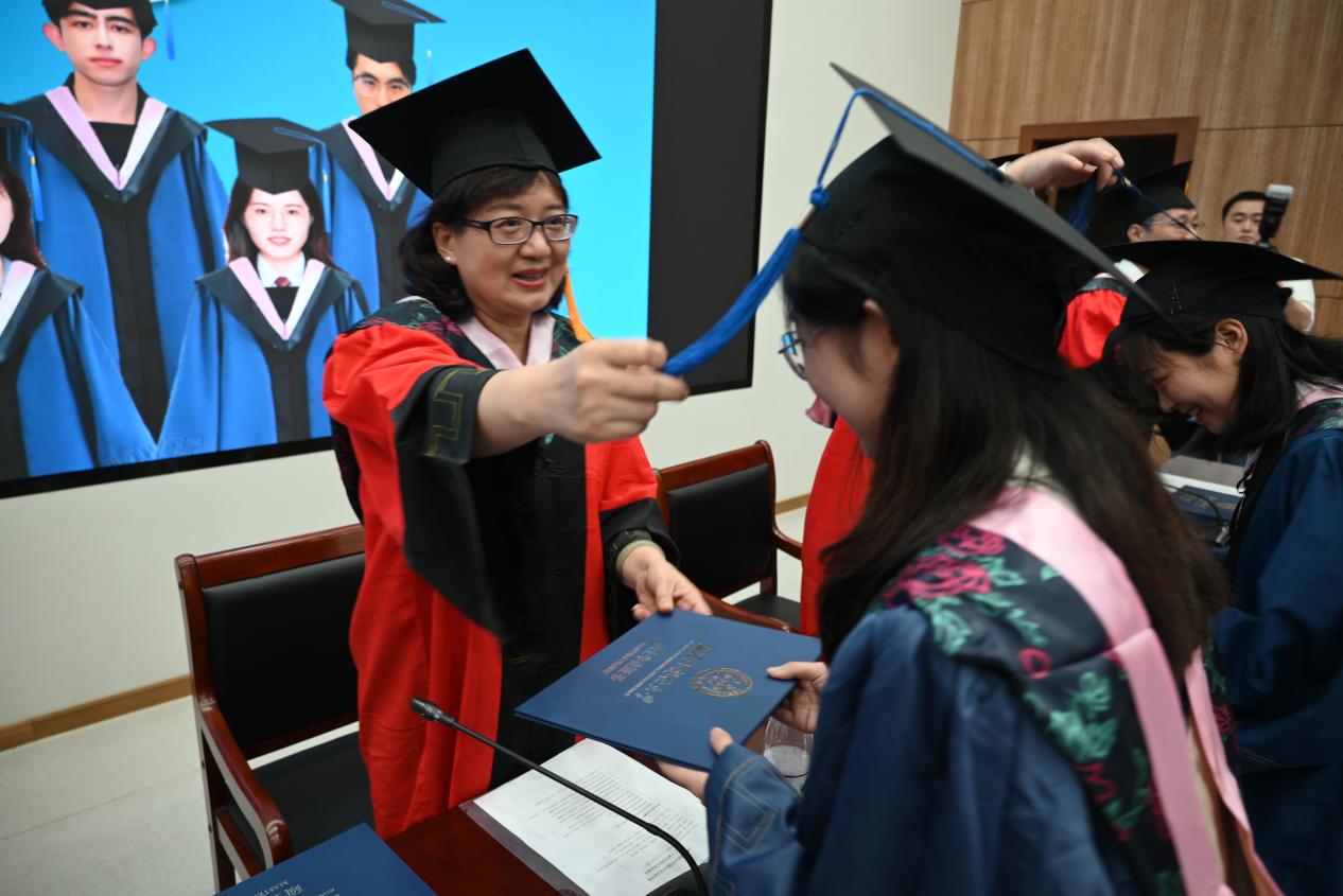 最后,现场的2023届毕业生依次登台领取了毕业证书和学位证书,往届生也补上了拨穗仪式。今年,国际文化交流学院共有185位中外同学顺利完成了学业。其中本科留学生98人,中外硕士研究生84人,博士研究生3人。其中,除中国学生外,还有来自韩国、泰国、俄罗斯、白俄罗斯、日本、美国、巴西、乌克兰、土耳其、埃及、哈萨克斯坦、吉尔吉斯斯坦、乌兹别克斯坦、越南、老挝、 印度尼西亚、巴布亚新几内亚和喀麦隆等全球18个国家的留学生,凸显了“中外一家,合作共进”的学院办学优势与特色。