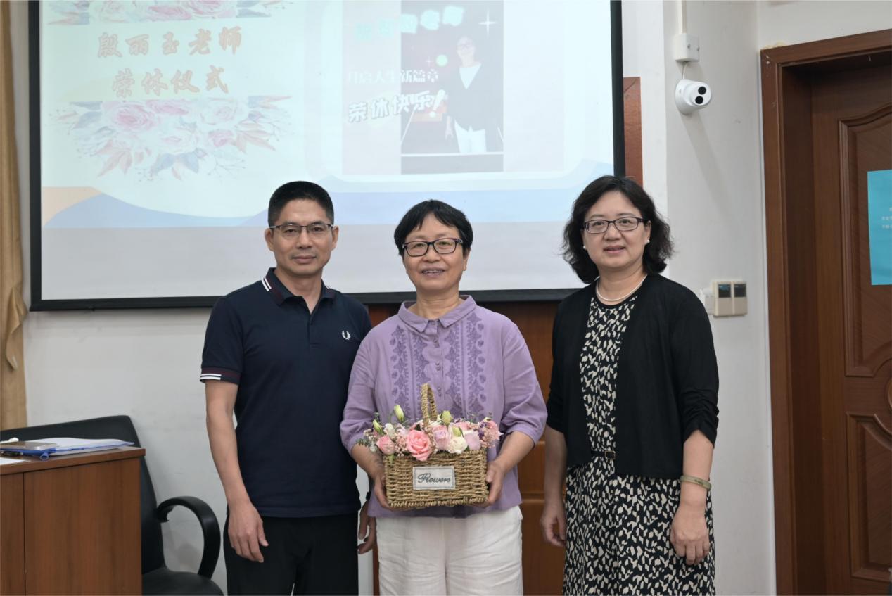 会议最后,学院为殷丽玉副教授举办了简短而温馨的荣休仪式。殷老师回顾在上外国交学院工作的二十余年历程,表示“对这份职业,多的是热爱与不舍;对领导和同仁,缔结的深厚情谊将永存”。仪式中,院长和书记共同向殷老师送上鲜花与诚挚的祝福,感谢她对中国语言文化传播的热忱和为国际中文教育事业做出的贡献。退休不褪色,离岗不离心,祝福殷老师在人生新阶段遇见更宽广的山海,谱写更绚丽的华章。
